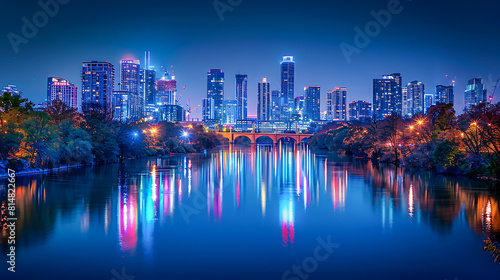 © Chananphat, Fototapeta premium Night cityscape with colorful lights reflecting on river