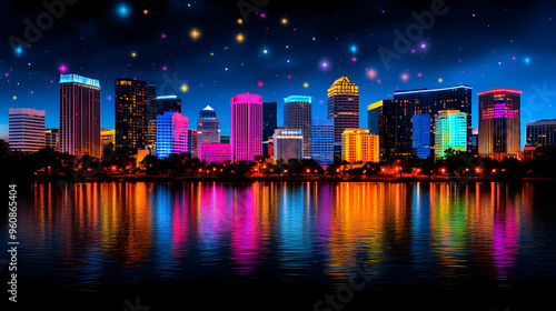 © suwatthana, Fototapeta premium Night Cityscape with Colorful Skyscrapers and Starry Sky Reflection in Water