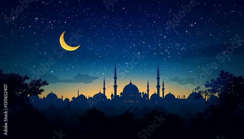 Naklejka premium Night cityscape with crescent moon and mosque silhouettes.