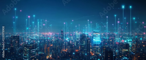 © artwiyanastudio, Obraz premium Night cityscape with digital network connections. (2)