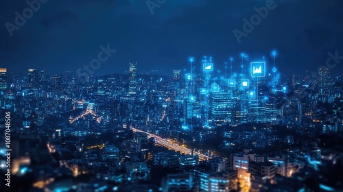 © BloomArt, Obraz premium Night cityscape with digital network overlay.
