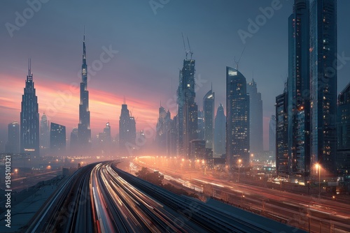 Fototapeta premium Night cityscape with futuristic towers and bright lights in Dubai, United Arab Emirates, shrouded in a misty haze