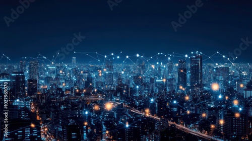 Fototapeta premium Night cityscape with glowing lights and connecting lines, symbolizing...