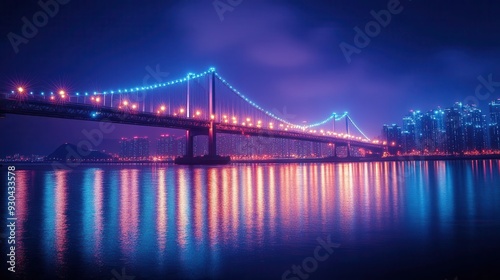 © Naphatson, Obraz premium Night cityscape with illuminated bridge and reflections in water.
