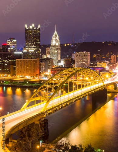 © Hilda, Fototapeta premium Night cityscape with illuminated bridge and river reflections