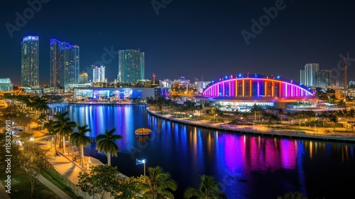 Naklejka premium Night cityscape with illuminated bridge and waterfront.
