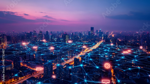 Fototapeta premium Night Cityscape with Illuminated Buildings and Network Connections