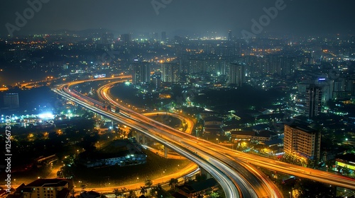© BerkahStock, Obraz premium Night cityscape with illuminated highway interchange and buildings.