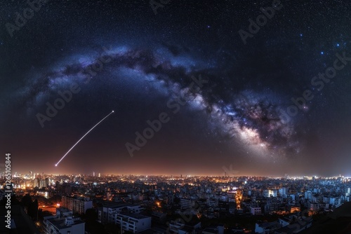© BerkahStock, Naklejka premium Night cityscape with Milky Way galaxy and shooting star.