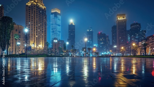 Fototapeta premium Night cityscape with rain reflecting on city streets, modern skyscrapers and...