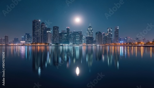 © Pete, Fototapeta premium Night cityscape with skyscrapers and full moon reflecting in river. Buildings shine with light. Urban skyline glows under dark sky. City view shows towers mirrored in water with copy space.
