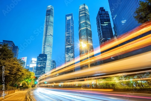 © mohdfaizal, Fototapeta premium Night Cityscape with Skyscrapers and Light Trails in Urban Setting