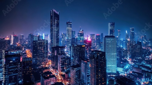 © Ali, Obraz premium Night cityscape with tall buildings and neon lights.