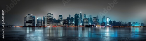 Fototapeta premium Night cityscape with tall buildings reflected in the water.