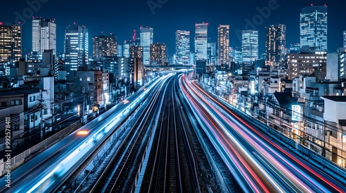 © senyumanmu, Obraz premium Night Cityscape with Train Tracks and Light Trails