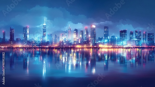 Fototapeta premium Night Cityscape with Water Reflection Urban Skyline Modern Architecture...