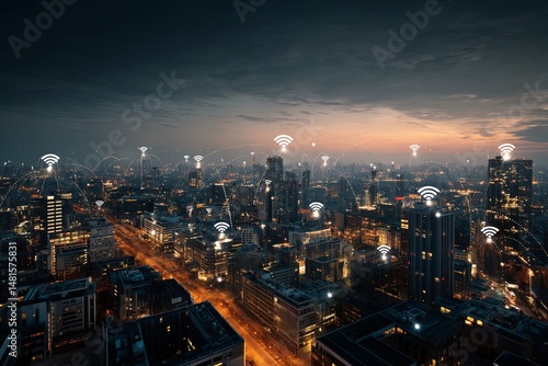 © Ketsaratchaya, Fototapeta premium Night Cityscape with Wireless Connection Symbols Illustrating Urban Connectivity and Technology Trends