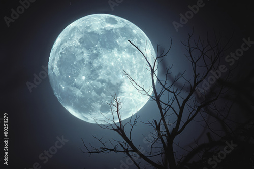 © Peopleimages - AI, Fototapeta premium Night, dark and tree in nature, environment and bright with glow, shine and forest in Switzerland. Peace, evening and branches for mystery of fantasy, outdoor and woods with sky, calm and earth