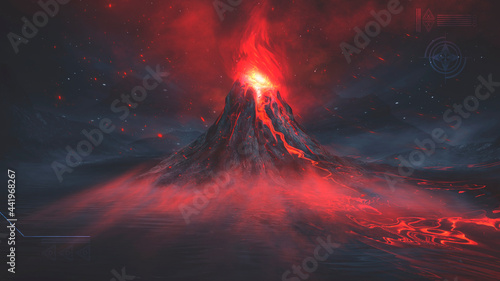 © MiaStendal, Fototapeta premium Night fantasy landscape with abstract mountains and island on the water, explosive volcano with burning lava, neon light. Dark Futuristic natural scene with reflection of light in the water. 3D