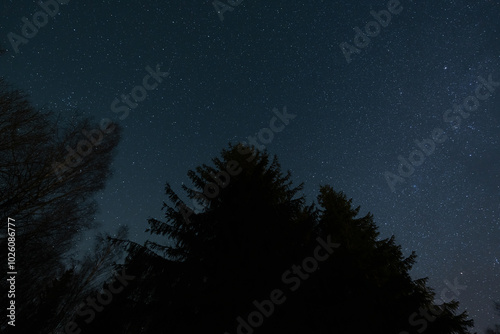 © Dmitri, Fototapeta premium Night forest and clear starry sky, nature of Estonia.