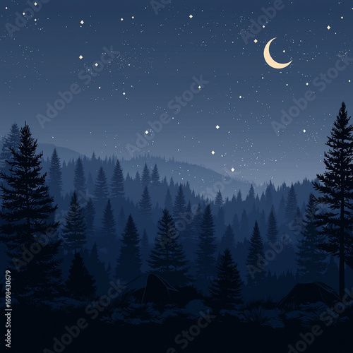 © zhihai, Naklejka premium Night forest landscape illustration with crescent moon shining over pine trees and starry sky