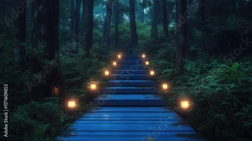 Obraz premium Night forest path, lit stairs, mystical scene, fantasy setting