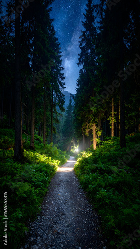 © Muhammad, Fototapeta premium Night forest path with starlit sky.