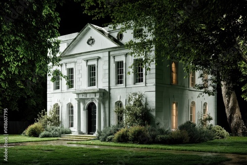 © RICH, Naklejka premium Night Garden with Tree Bench and Classic Architecture