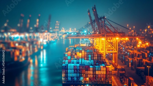 Fototapeta premium Night harbor, cargo ship loading, container port, city lights, global trade