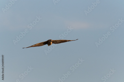 Fototapeta premium Night heron in flight on a blue sky at sunset