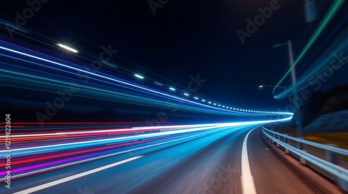 © Dragon Stock, Obraz premium Night Highway Speed - Vivid Light Trails on a Winding Road