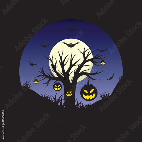 Fototapeta premium Night illustration with trees, Halloween, bats, pumpkins on circle background.