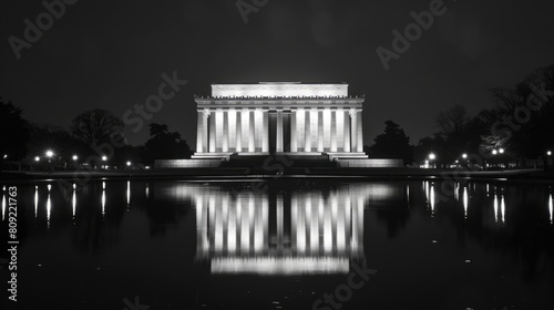 Obraz premium Night in town: Illuminated Historical Building with Water Reflections