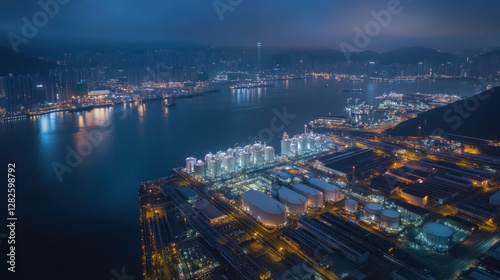 © kucret, Fototapeta premium Night industrial harbor, city skyline, energy production, water reflection, aerial view