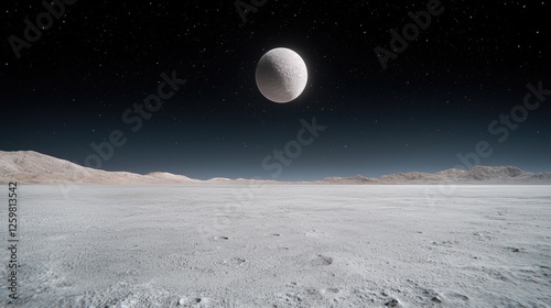Naklejka premium Night landscape, desert planet, large moon, starry sky, science fiction backdrop