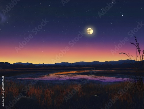 © lareyna, Fototapeta premium night landscape painting full moon calm water dark silhouettes distant hills