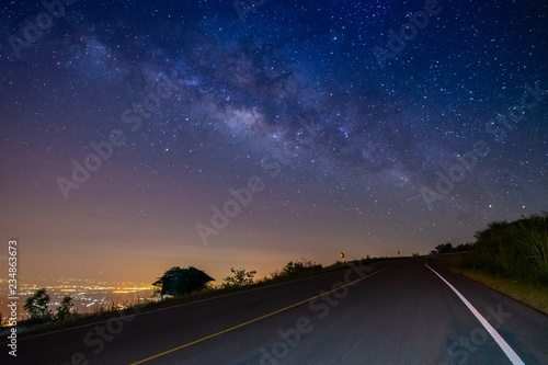 Naklejka premium night landscape road on mountain and milky way galaxy background ,Thailand ,...