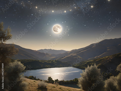 © Diedo, Fototapeta premium night landscape with moon and mountains