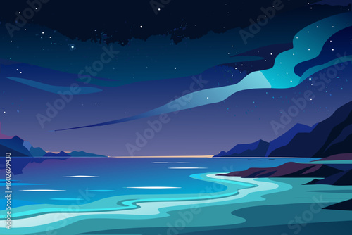 © MAYENUDDIN, Fototapeta premium Night landscape with sea mountains starry sky and aurora borealis effect
