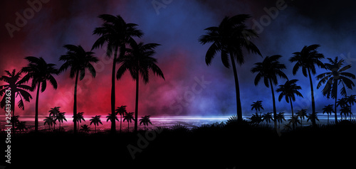 Obraz premium Night landscape with stars, sunset, stars. Silhouette coconut palm trees Vintage tone. Lights of the night city, neon, coast.