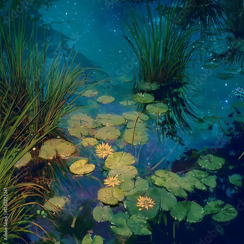 © Waqar, Fototapeta premium night landscape with water lilies