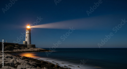 © wavemotion, Fototapeta premium Night lighthouse on the beach