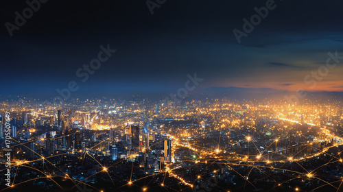 © banlai, Naklejka premium Night lights, a city of modern business and smart digital innovation with a network of interconnected rewards over the cityscape of the future smart wireless digital city and social media network