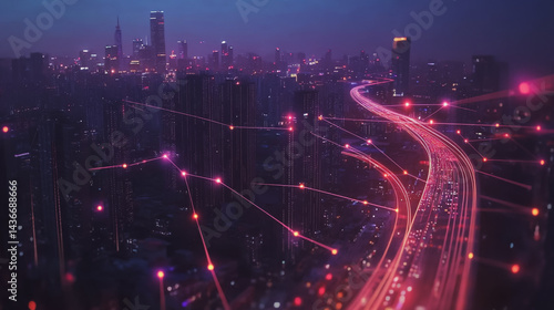 © banlai, Naklejka premium Night lights, a city of modern business and smart digital innovation with a network of interconnected rewards over the cityscape of the future smart wireless digital city and social media network that