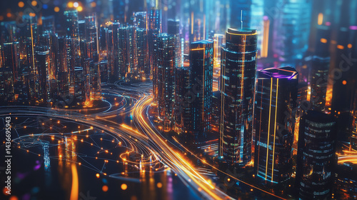 © banlai, Obraz premium Night lights, a city of modern business and smart digital innovation with a network of interconnected rewards over the cityscape of the future smart wireless digital city and social media network that
