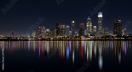 Naklejka premium Night Lights Reflecting on Calm Waters Stunning Louisville Skyline Panorama...