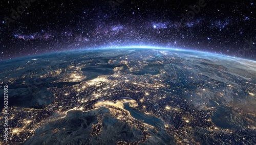 © Atstsaniyah, Fototapeta premium Night-lit Earth's curvature viewed from space, showcasing city lights against a star-studded Milky Way backdrop