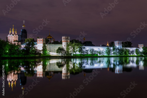 Fototapeta premium night Moscow Novodevichy monastery river reflection