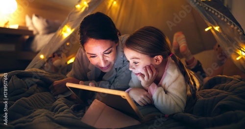 Naklejka premium Night, mother or child with tablet in fort for bonding together, reading ebook or bedtime story. Relax, parent or daughter with tech in home for online fairytale, kids storytelling app or literature.