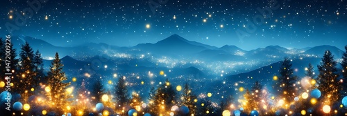 © tukang, Fototapeta premium Night Mountain Scene with Lights and Trees